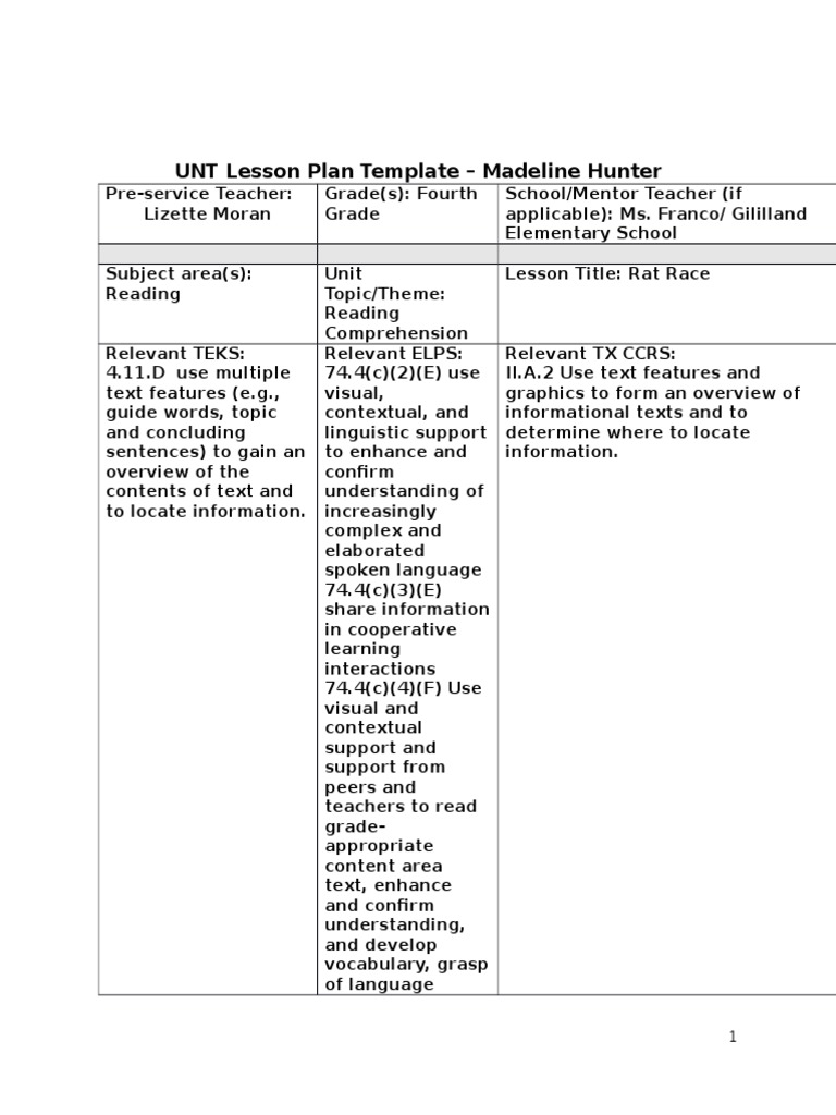 3rd Observation Unt Lesson Plan Template Madeline Hunter Reading